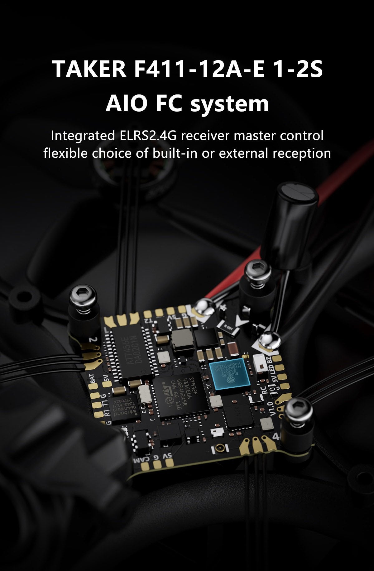 - Das TAKER F411-12A-E 1-2S AIO-Flugsystem integriert einen ELRS 2.4G-Empfänger, der weniger Platz benötigt und kostengünstiger ist.