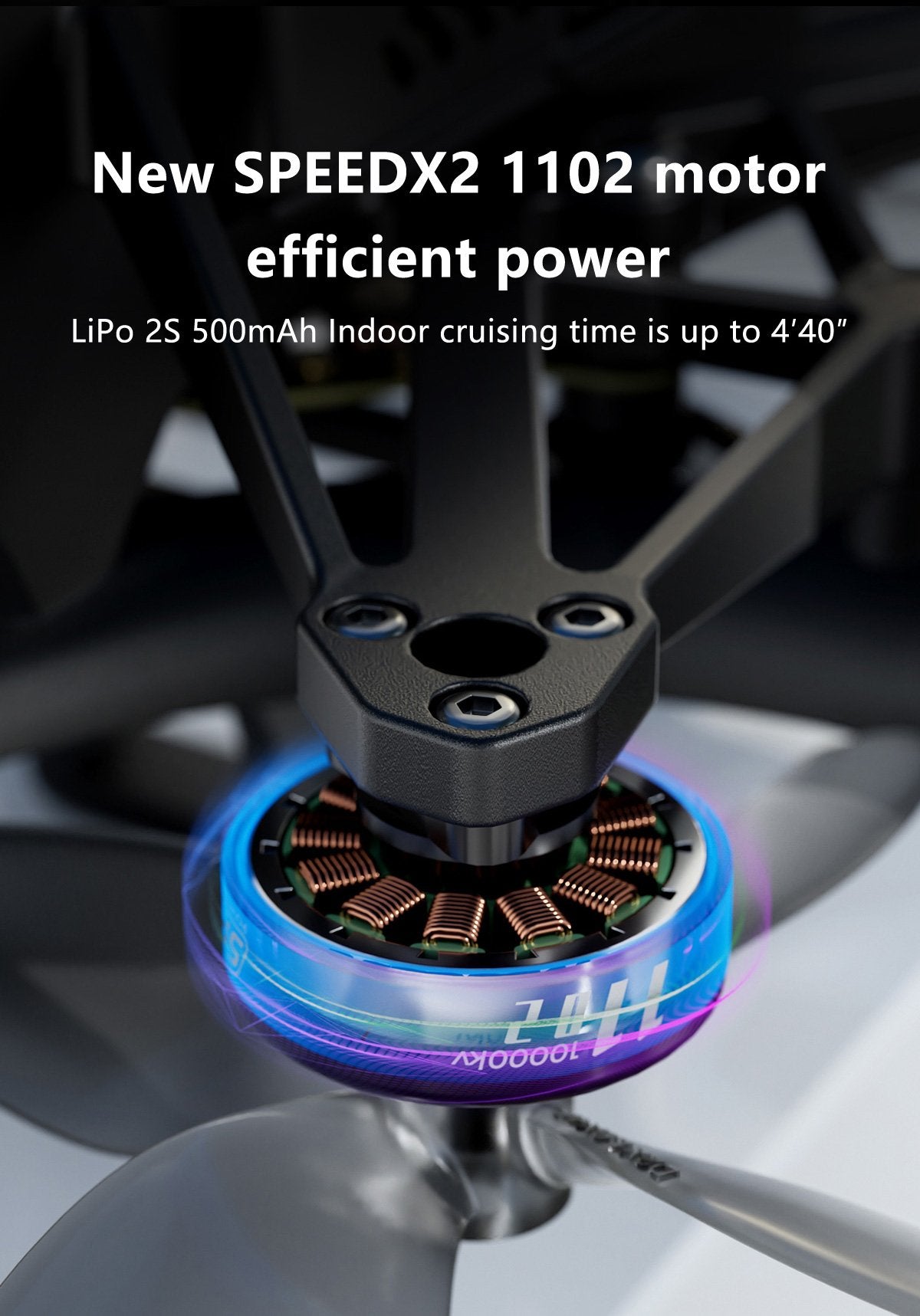 - Der neue SPEEDX2 1102-Motor mit HQProp DT51mm x4-Propellern kann eine ideale Akkulaufzeit erreichen.