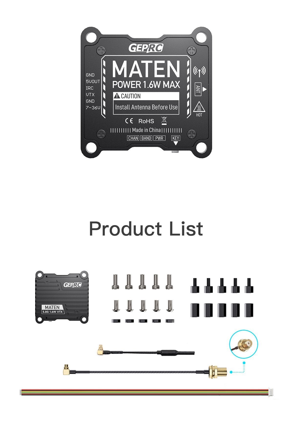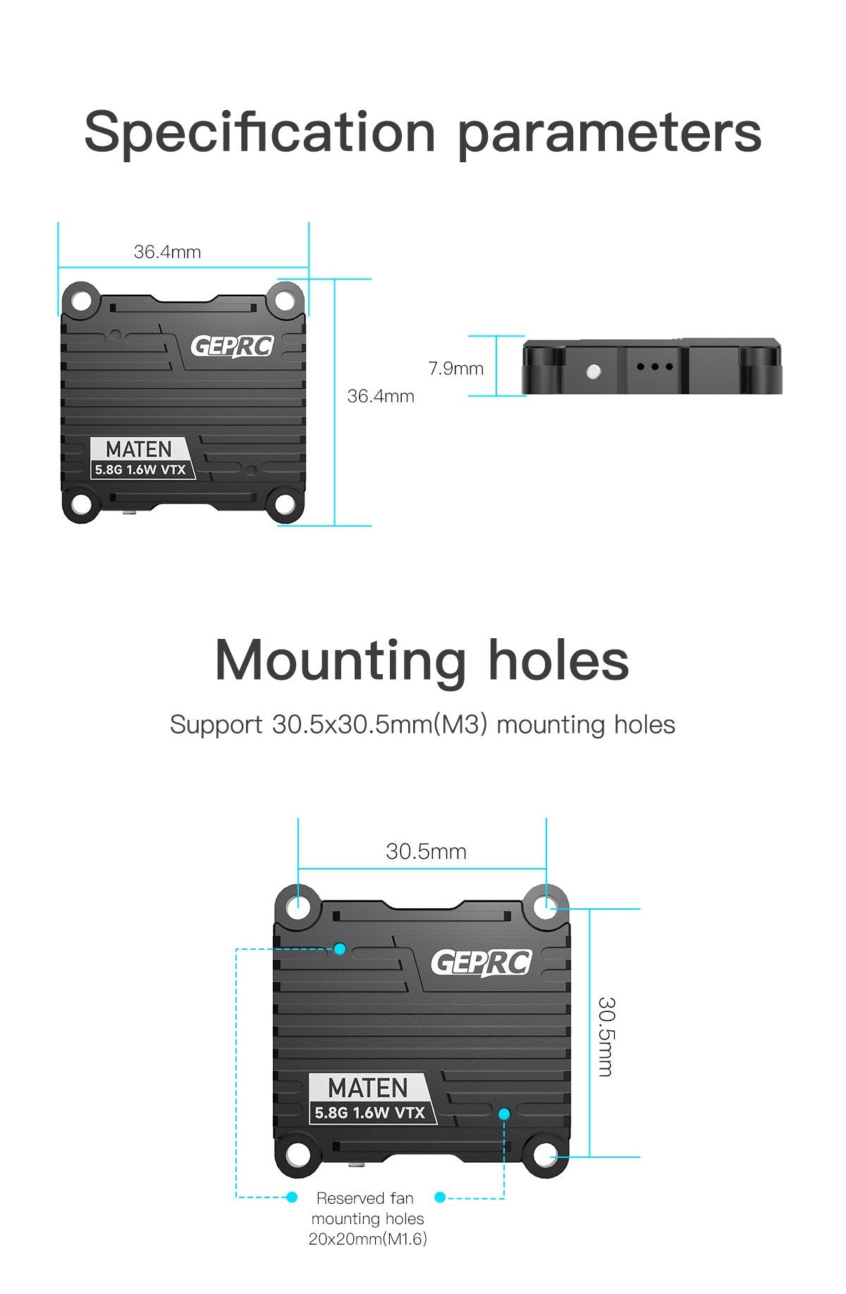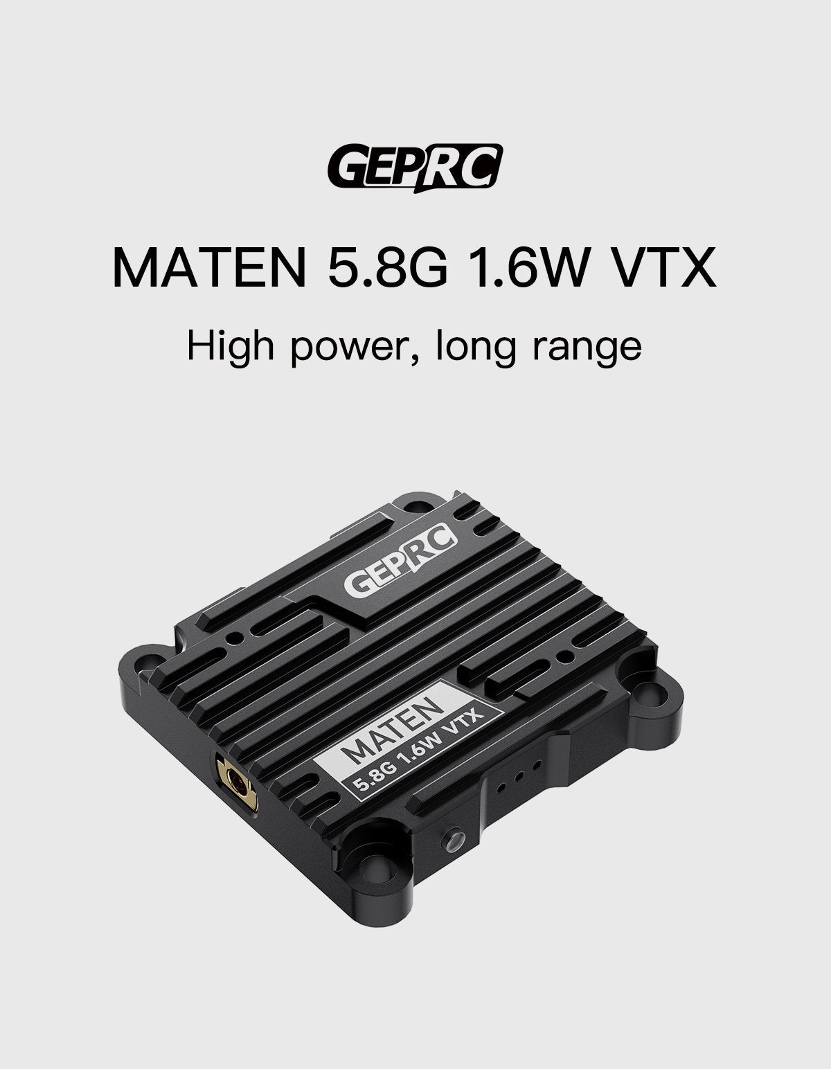 Die vom GEPRC-Team neu entwickelte MATEN 5.8G 1.6W VTX Hochleistungs-Bildübertragung ist nun offiziell erhältlich. Sie bietet eine sehr hohe Leistung mit vier einstellbaren Leistungsstufen und einer maximalen Leistung von bis zu 1600 mW. Das Übertragungssignal ist sehr stabil und die Durchdringungsfähigkeit hervorragend.