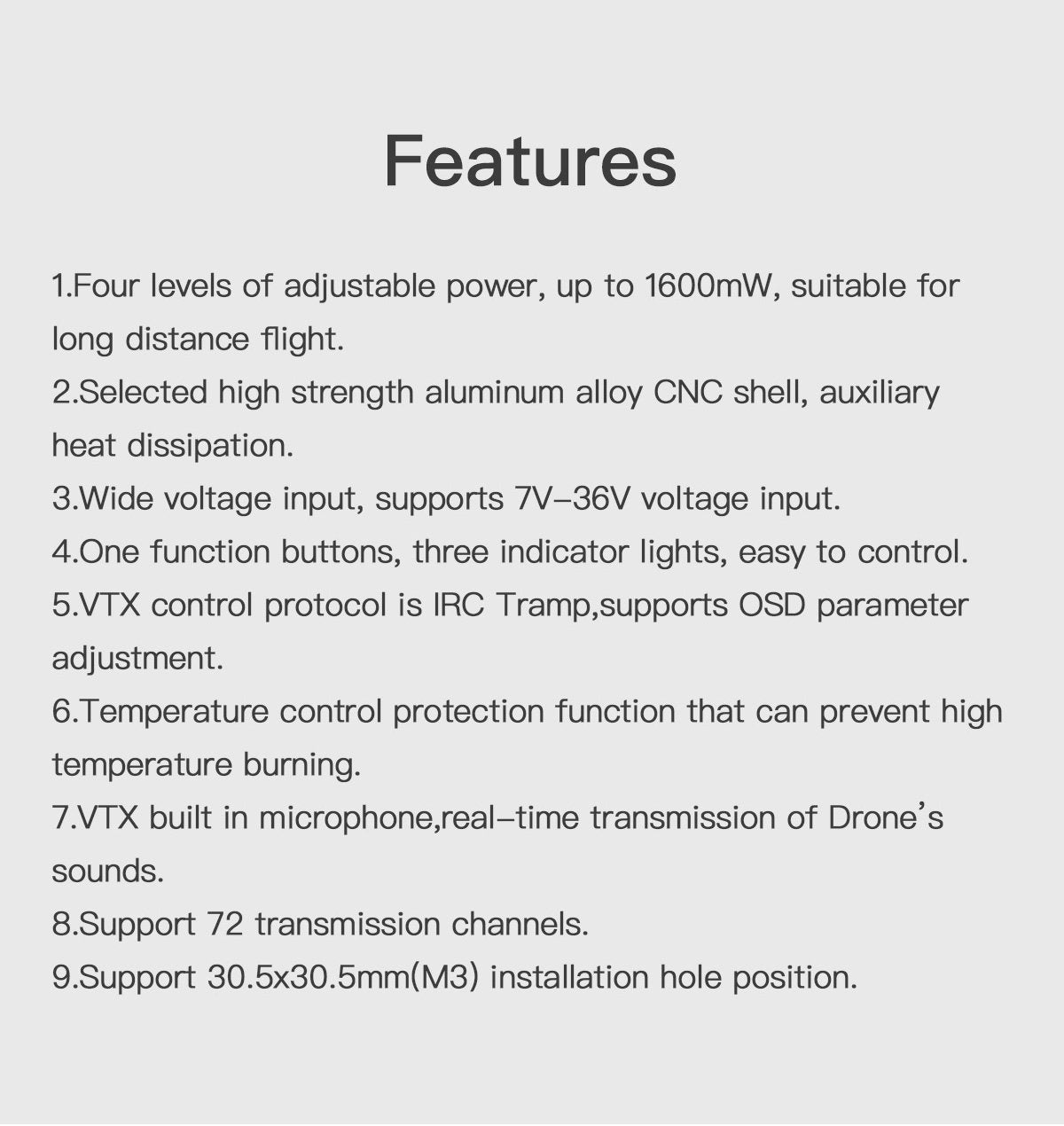- Vier Stufen einstellbarer Leistung, bis zu 1600 mW, geeignet für Langstreckenflüge.