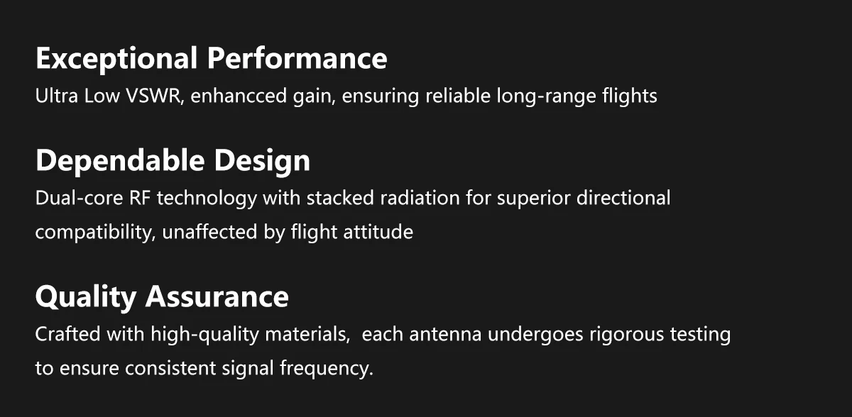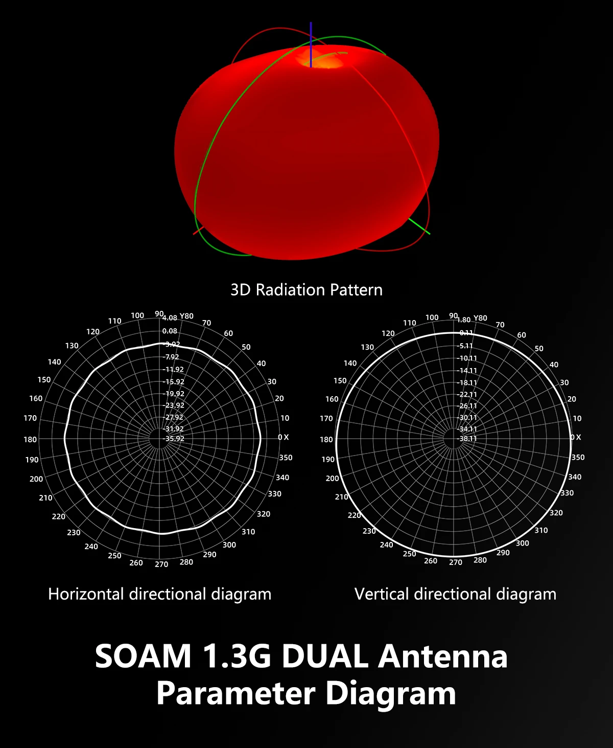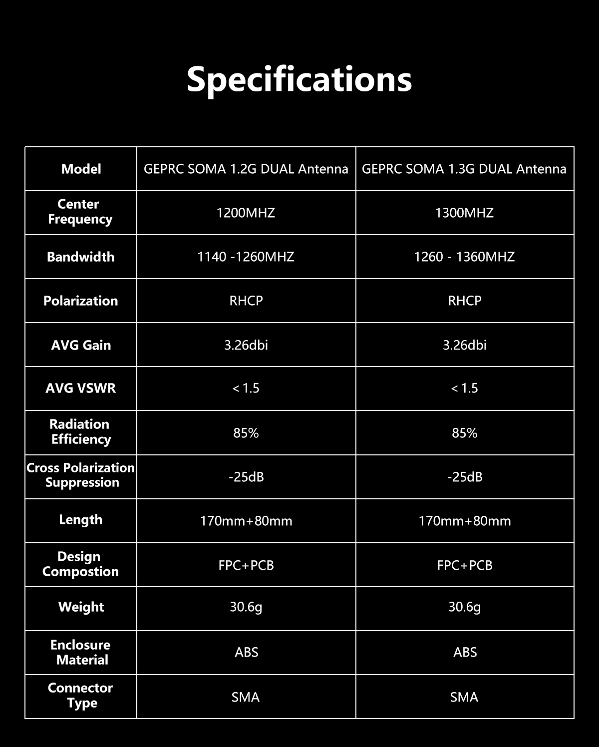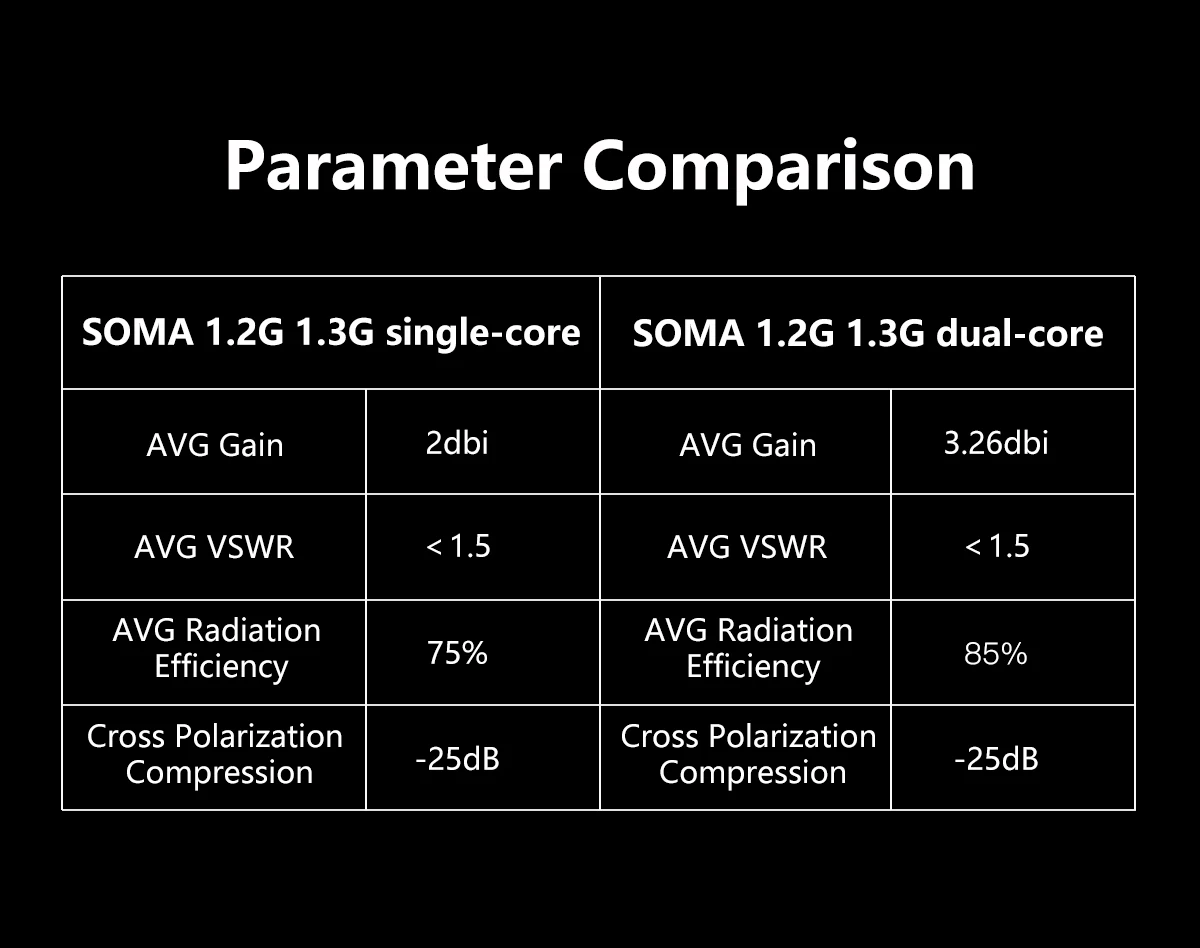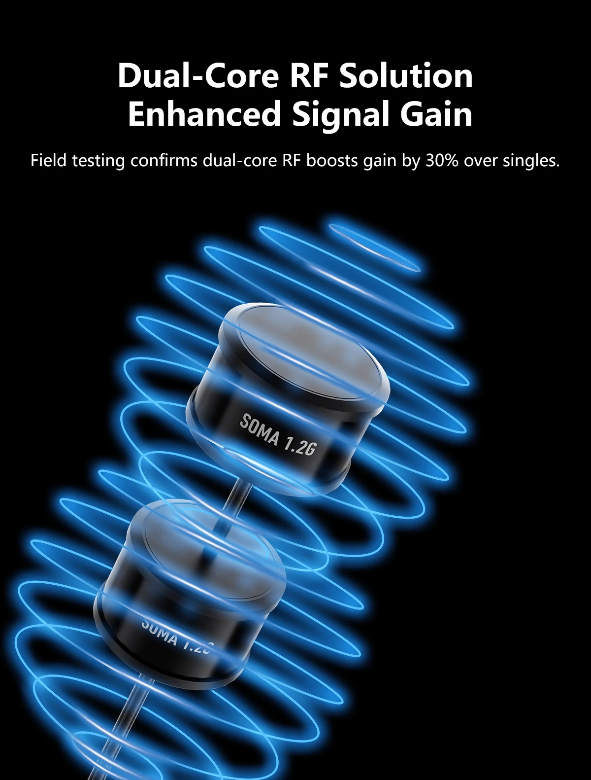 Die GEPRC SOMA 1.2G 1.3G DUAL Antenne verfügt über eine Dual-Core-HF-Lösung für verbesserte Verstärkung und größere Reichweite. Praxistests zeigen eine deutliche Verbesserung der Richtungskompatibilität. Die SOMA 1.2G 1.3G DUAL Antenne gewährleistet eine stabile und zuverlässige Bildübertragung während des Fluges und gewährleistet auch bei hohen Manövern eine hervorragende Signalabdeckung.