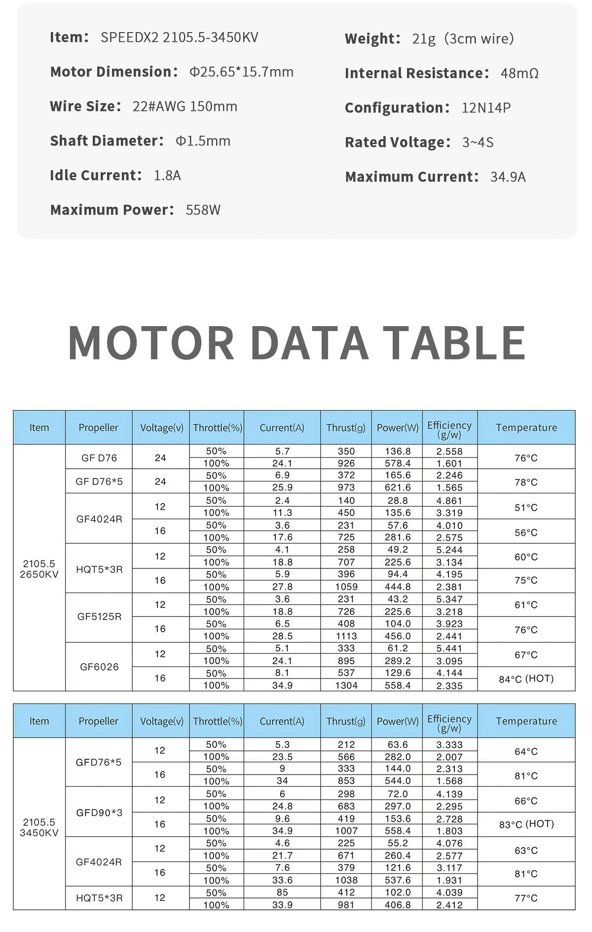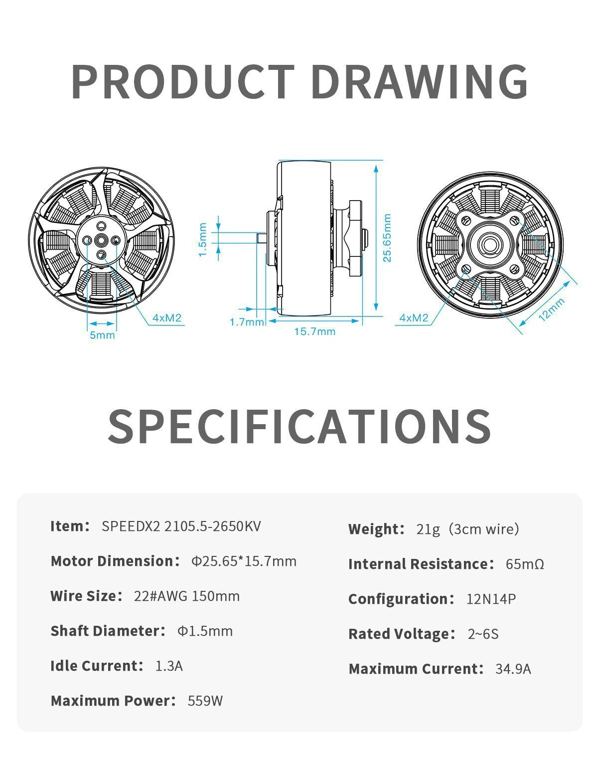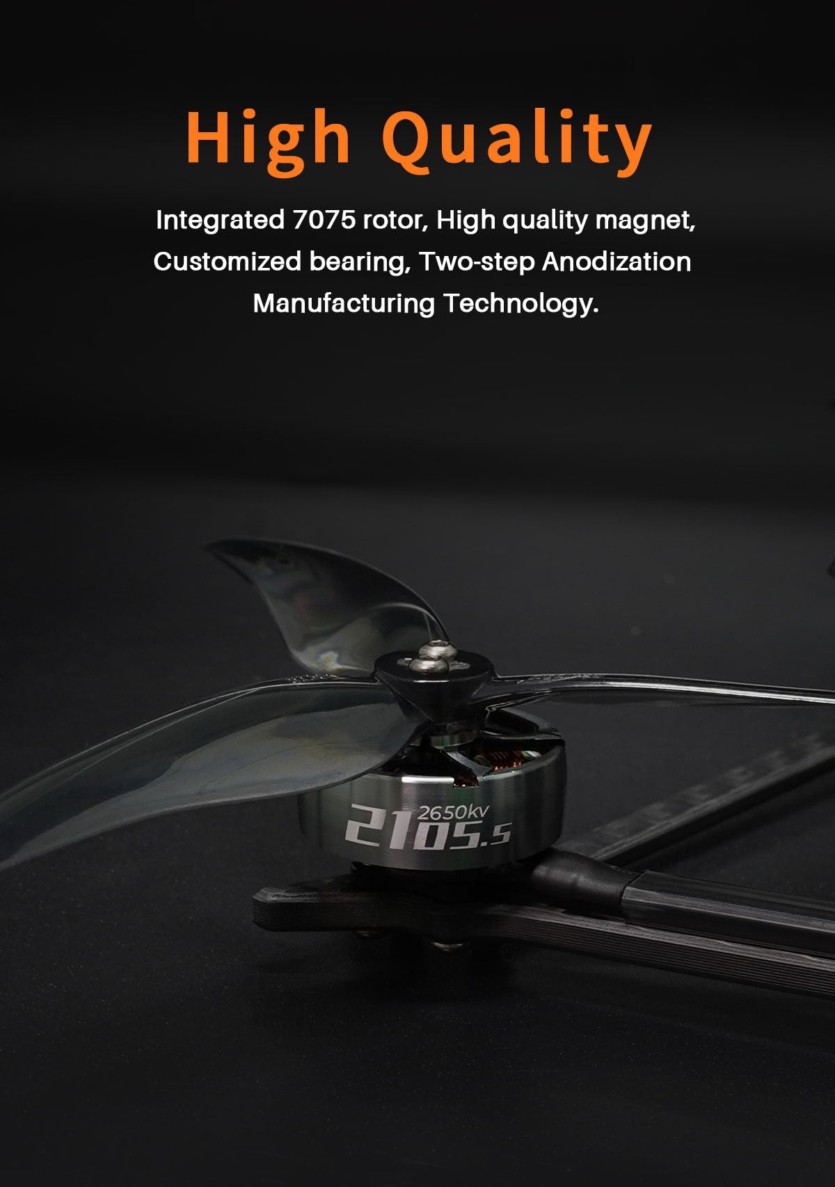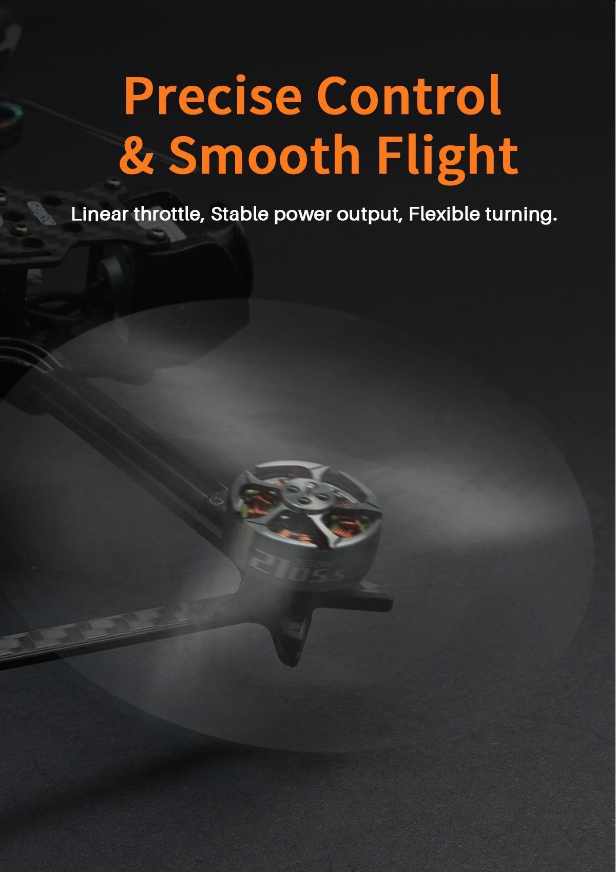 Im Hinblick auf die Konstruktion mit hoher Festigkeit weist SPEEDX2 2105.5 auch eine gute Haltbarkeit und Crashfestigkeit auf. Es ist ein idealer Motor für jeden Piloten, der seine eigenen 3–4 Zoll FPV-Quads oder 4–5 Zoll Langstrecken-FPV-Quads baut.