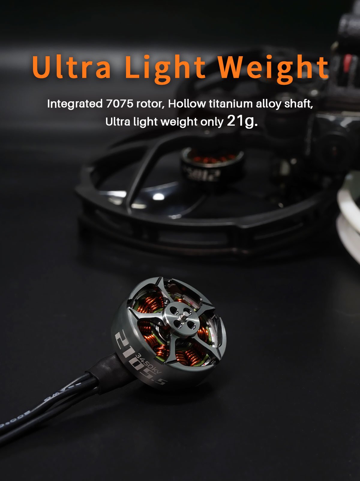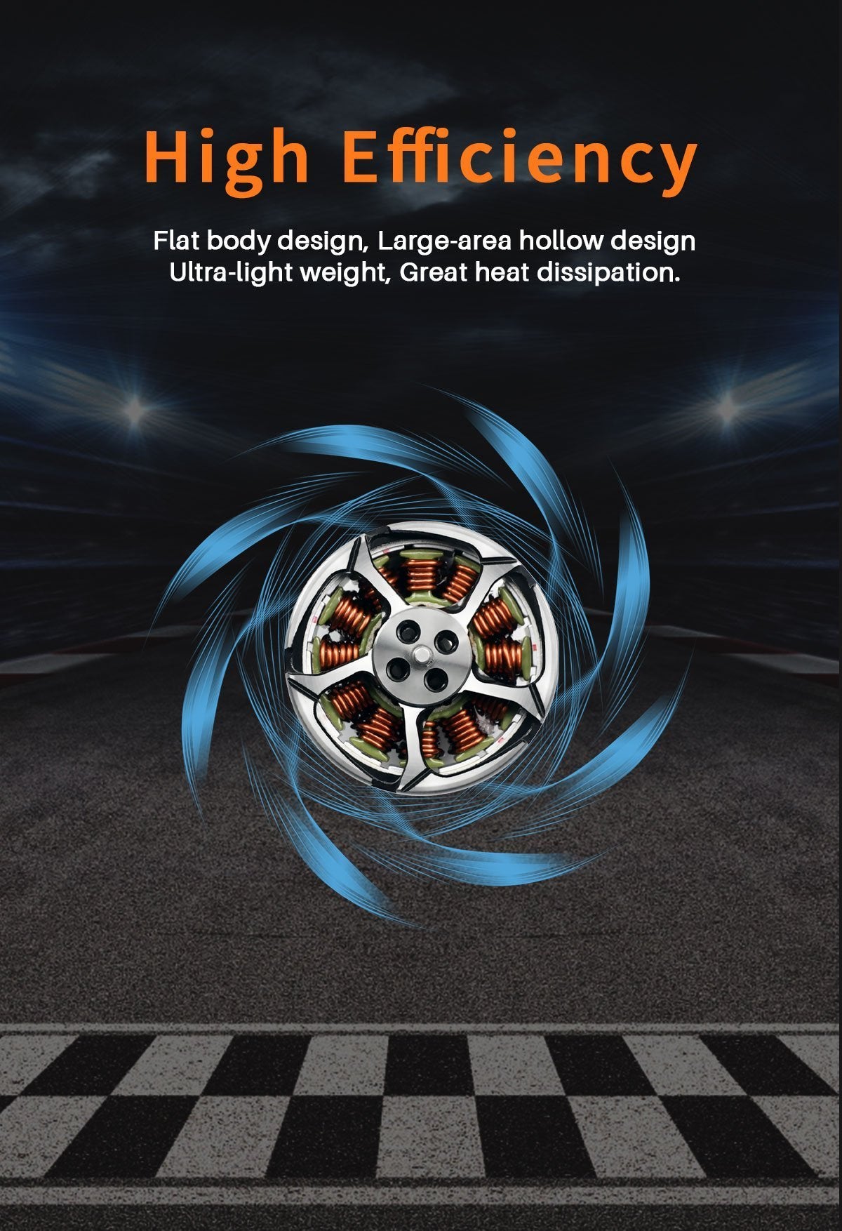 Das leichte Design reduziert das Gewicht deutlich auf nur 21,0 g. Die flache Motorform mit dem exquisiten „Hollow-Out“-Design im oberen Teil des Rotors trägt zur Verbesserung der Wärmeableitung bei. Der Vorteil liegt in der Aufrechterhaltung einer niedrigeren Temperatur des laufenden Motors.
