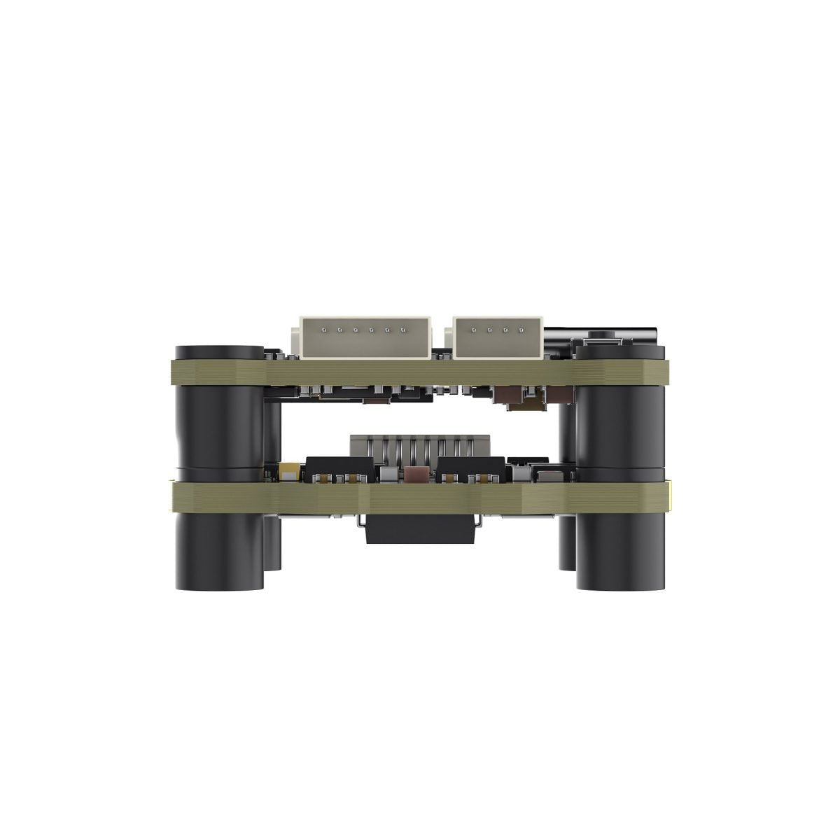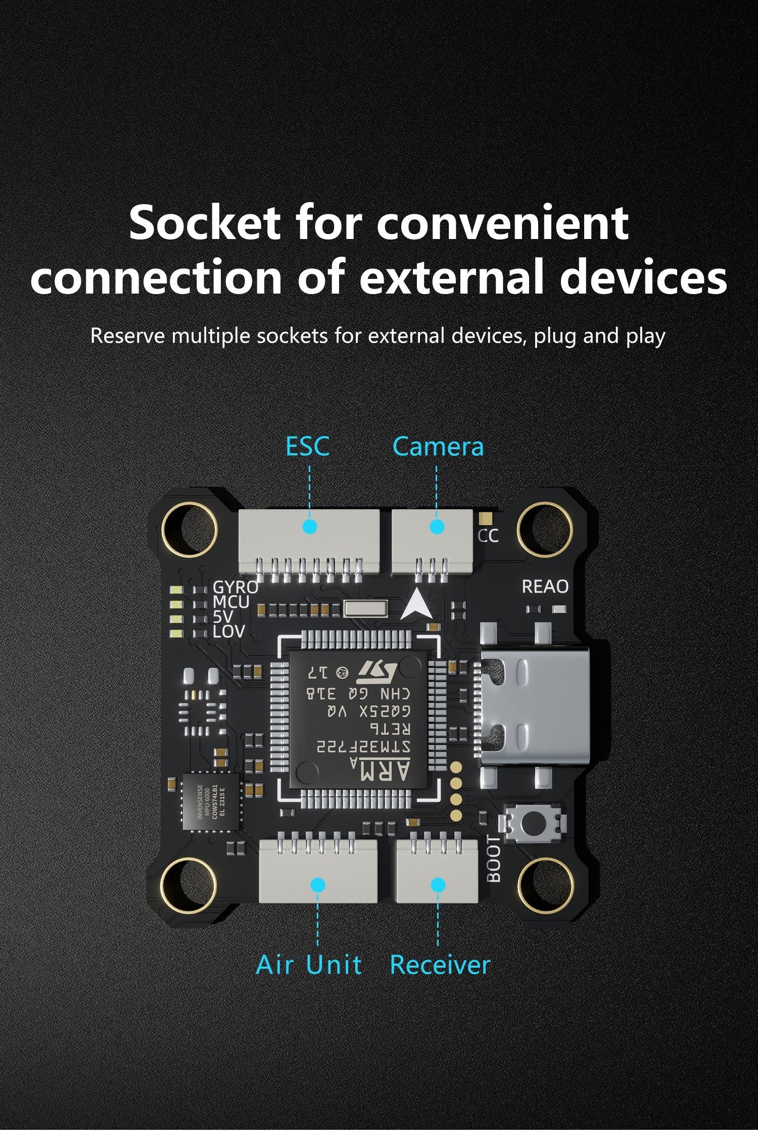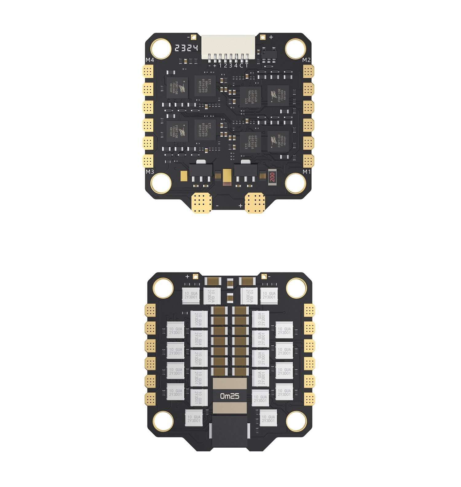 Die Montagelöcher aller Stapel haben eine Größe von 25,5 x 25,5 mm und sind damit mit den meisten marktüblichen Rahmen für die Installation von AIO-Flugreglern kompatibel. Die Stapelkombination trägt zur Wärmeableitung vom Hauptregler und den MOS-Röhren bei.
