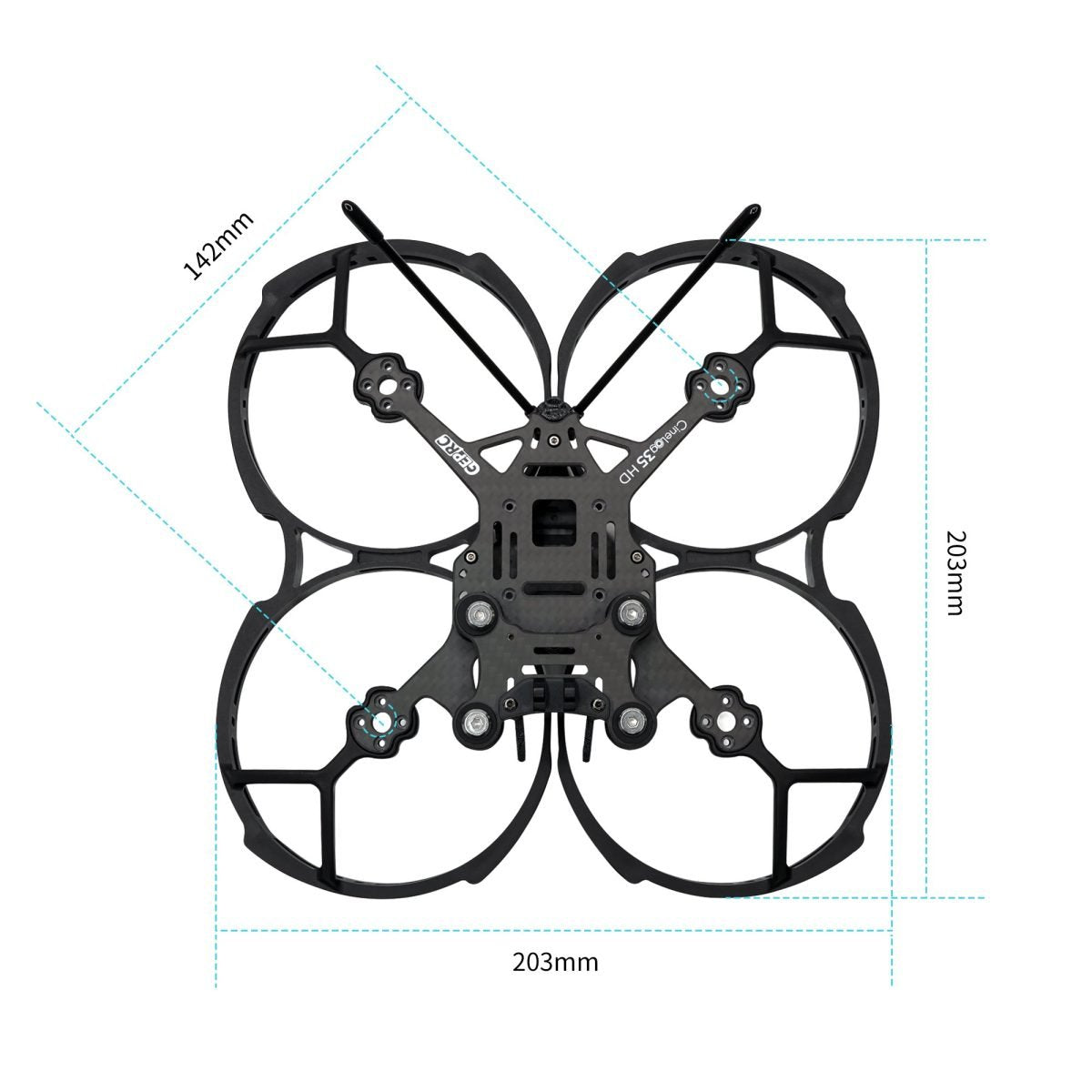 - Wymiary: 203 mm x 203 mm x 42 mm (wraz z osłoną śmigła)