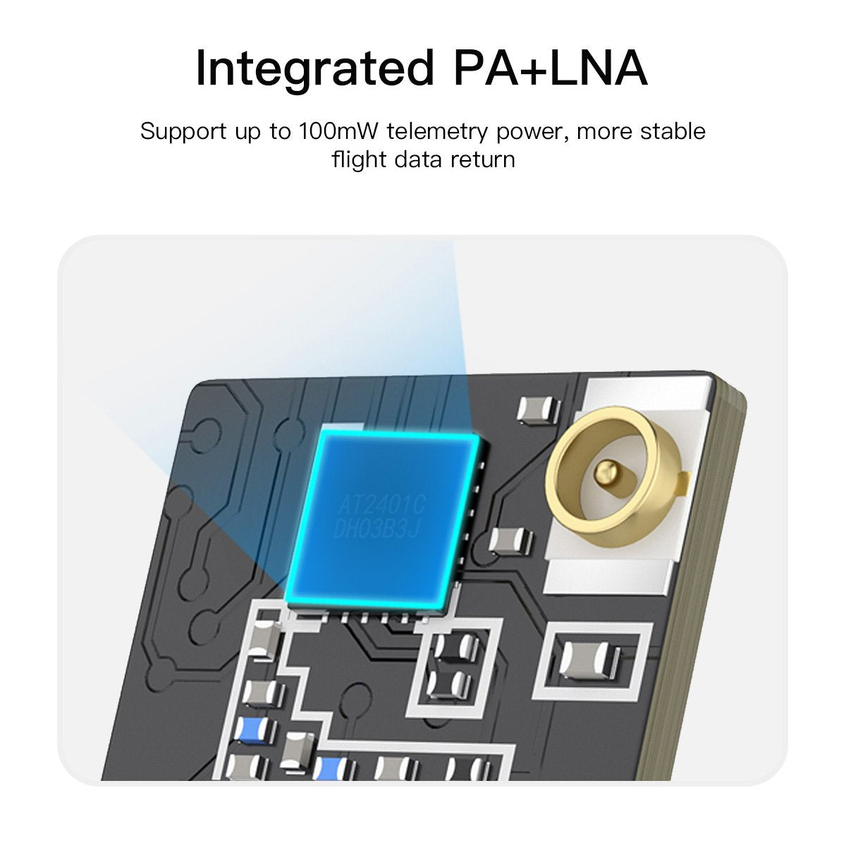 The ELRS Nano 2.4G PA100 Receiver uses a TCXO temperature compensated crystal oscillator to avoid frequency shifts caused by temperature changes;Integrated PA+LNA,the telemetry power is up to 100mW; Built-in WIFI antenna, firmware upgrade operation through WIFI.
