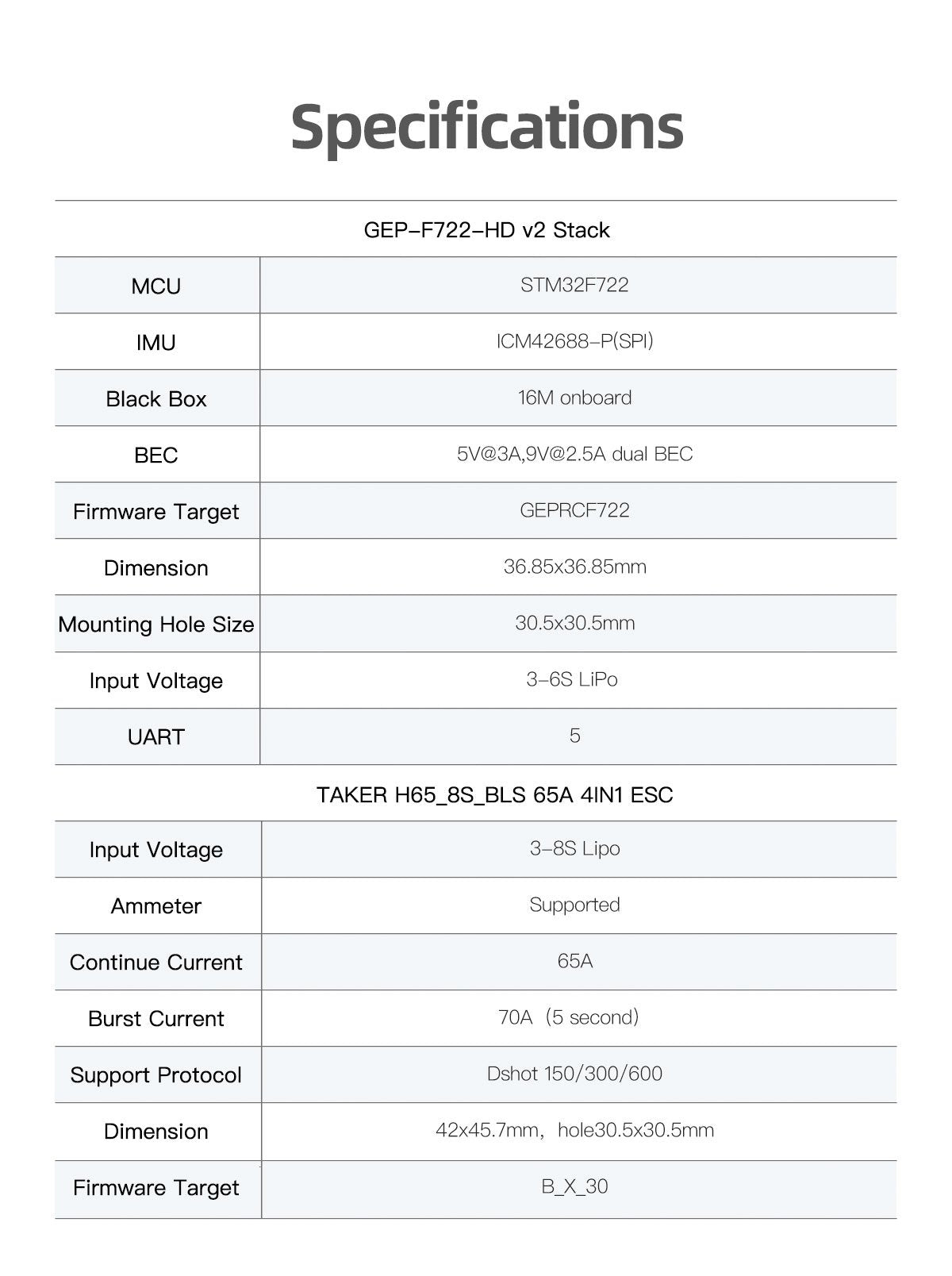 - Paired with the TAKER H65_8S_BLS 65A 4IN1 ESC, providing a smooth flying experience